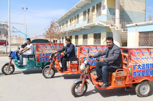 为扩大远程教育覆盖面,将远程教育延伸至最远1公里,最后一家人,结合党的群众路线教育实践活动,新疆新和县投资12余万元,为8个偏远村(组)配备了“流动宣传车”(具备功放和控放两种功能),方便了偏远村组群众收看新闻联播、电影节目和农业技术培训等视频讲座,有效解决了部分村级阵地开展远程教育活动不能有效覆盖偏远村组群众的问题。同时,还能为群众开展文艺娱乐活动提供平台,丰富群众的精神文化生活。图为,3月31日该县乡镇远程教育操作员喜领“流动宣传车”的场景。