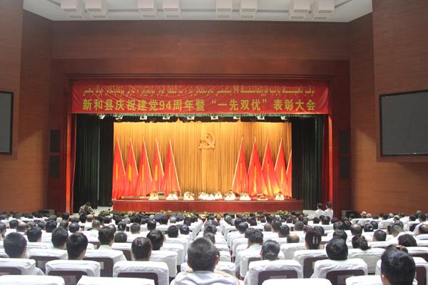 6月30日下午,新和县在行政会议中心1号大厅隆重举行庆祝建党94周年暨“一先双优”表彰大会,县四套班子在家领导,乡镇党政正职、党务副书记,县直各单位(部门)副科级以上干部,退休党员干部代表等500余人参加表彰大会。会议由县委副书记、县长艾买尔江·依明同志主持,县委书记马国强同志作重要讲话。